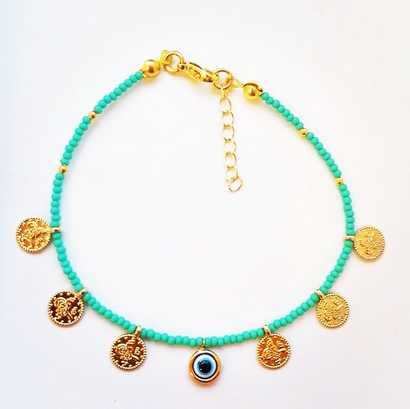 Długość (z łańcuszkiem) 20 cm – możliwa regulacja Mosiądz pozłacany, koraliki w kolorze jasnego turkusu. Środkowy element to tzw. oko proroka (evil eye), symbol ochronny. Kraj pochodzenia – Turcja.