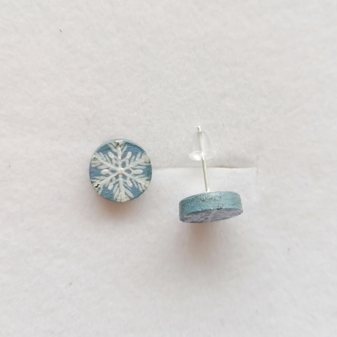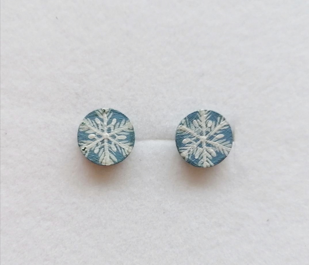 malutkie, okrągłe kolczyki drewniane, ręcznie malowane w drobniutki wzór płatków śniegu. Sztyft ze stali chirurgicznej ( bez dodatku niklu).
