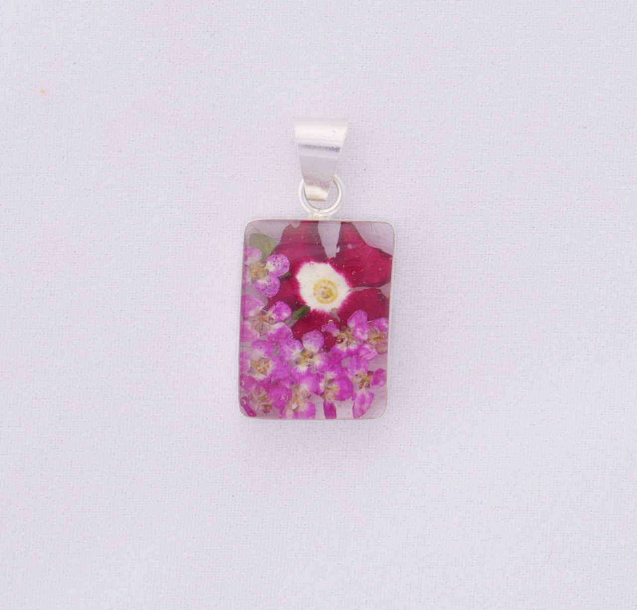 prostokątny  wisiorek z kompozycją z naturalnych kwiatków (werbena, smagliczka) zalanych przezroczystą żywicą epoksydową, oprawiony w srebro.